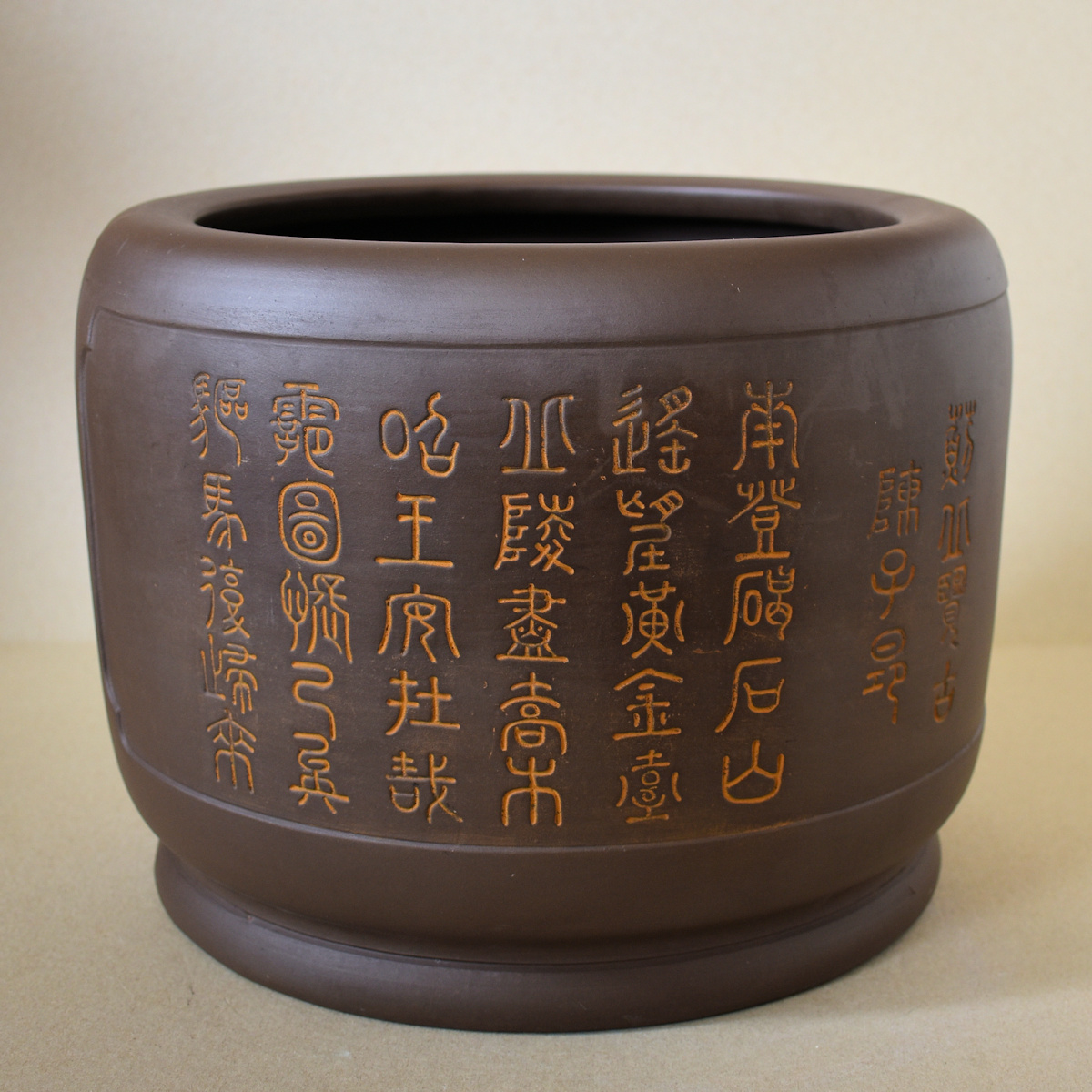 戦前出来のやや大振りな常滑焼手焙り火鉢です。胴の半面の窓枠に楼閣山水図、逆半面の窓枠には石山碑の漢詩が描かれています。二種類の胎土を使用し、陰刻部の色が異なる点が洒落ています。胴部に若干の擦り傷がありますが、その他経年相応の観です。底面脇に常一八三の統制番号が入っています。高さ24cm、内径31cm、外径34cm。