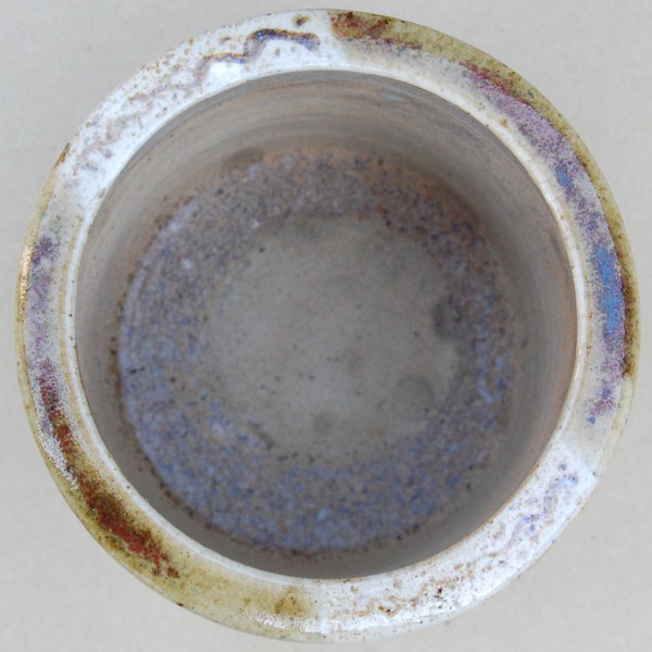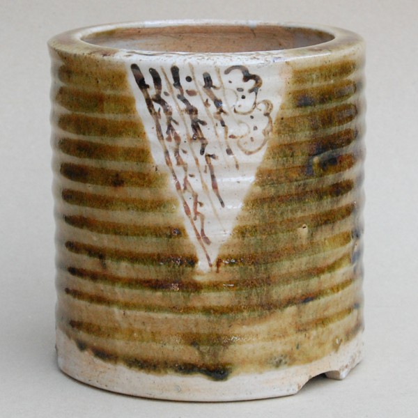 小振りな織部焼の筒型夏火鉢で、透明感ある緑釉と三角に抜かれた白地がシャープな印象です。全般に使用感は少ないのですが、口部縁等に小さな釉薬剥がれがあります。複数在庫品ですが、絵付や釉薬の雰囲気が種々異なります。高さ17cm、内径13cm、外径16.5cm。